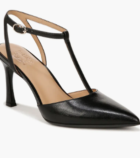 A pointy toe and tapered heel balance a striking pump designed in a T-strap silhouette for contemporary allure.