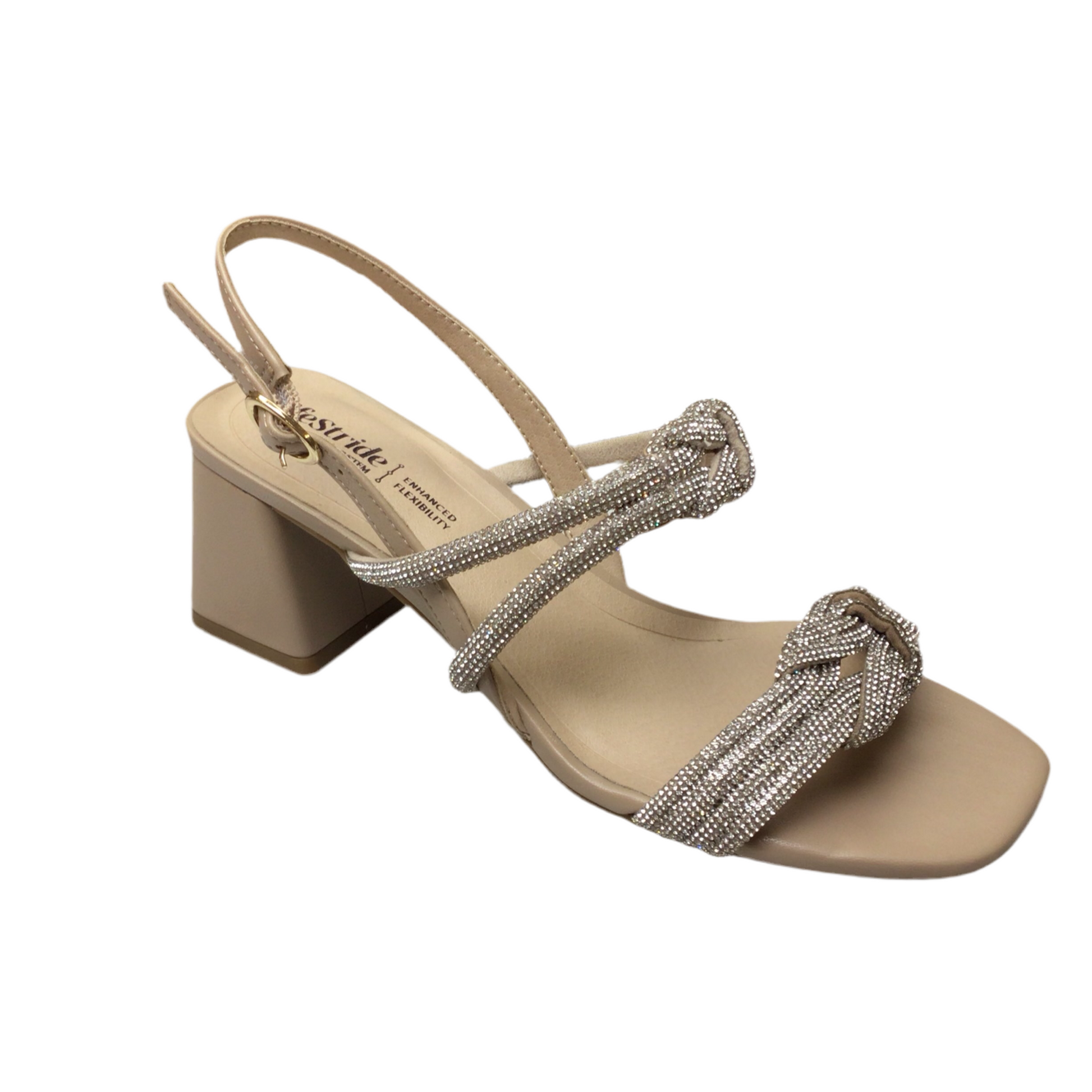 Sparkle, but make it chic in these stunning women's block heels with soft, rhinestone-studded straps. Perfect for weddings and special occasions. Sling back heels designed with faux leather, an open square toe, adjustable buckle with built-in stretch, and stunning knotted rhinestone straps. Linings crafted from partially recycled materials.