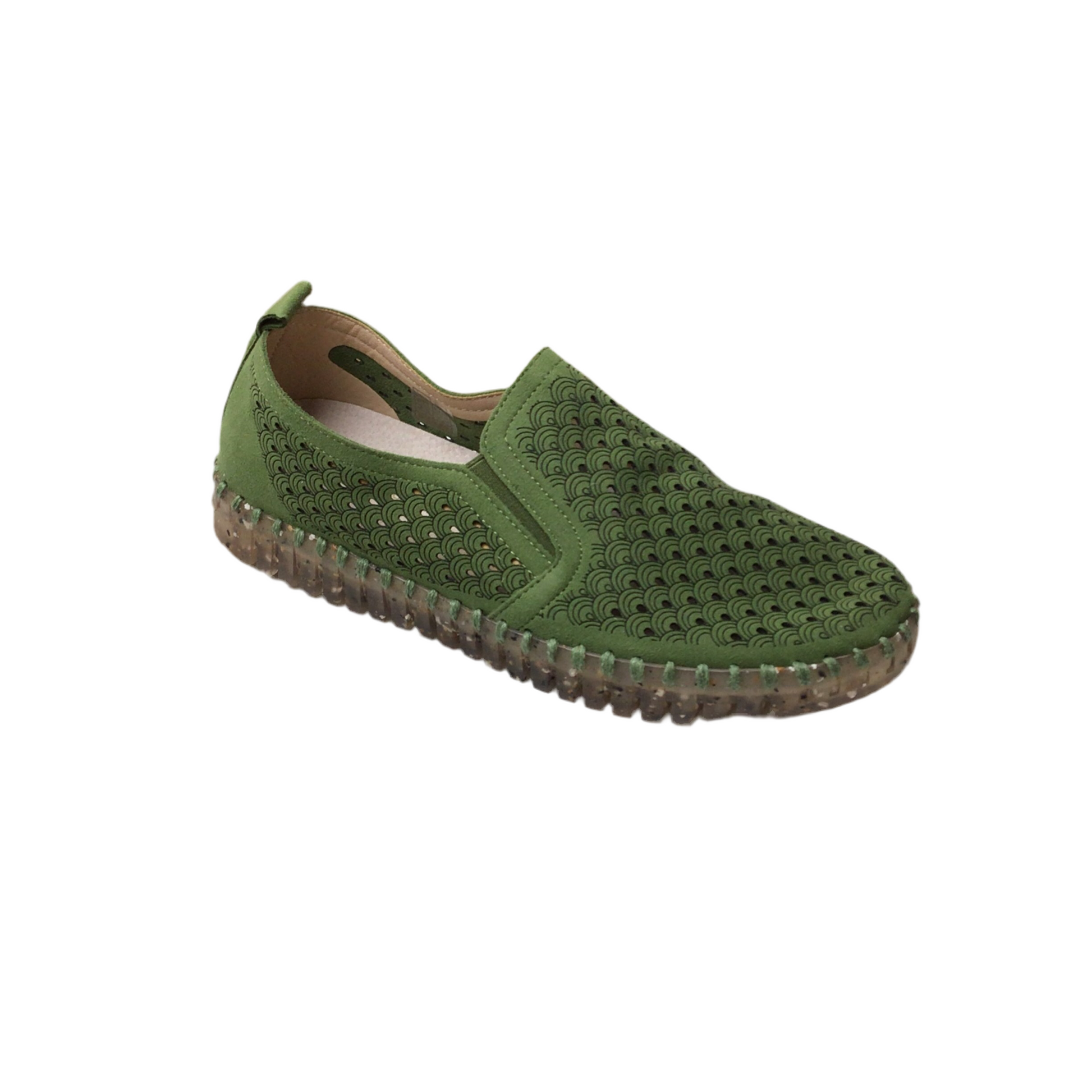 A smooth and finely woven upper create a mixed-media effect on a comfortable slip-on sneaker that's whipstitched to a flexible rubber sole.