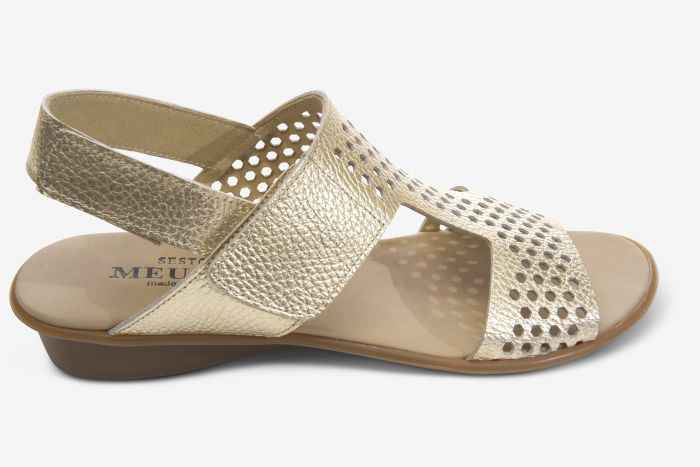 Perforated leather Sandal. Hook-and-loop strap. Padded insole. 1.25 inch wedge heel. Flexible rubber sole.