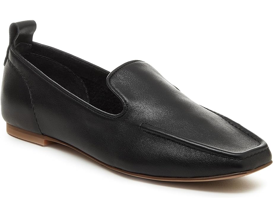 A squared-off toe and rear pull-tab lend modern elements to a loafer-inspired flat rendered in rich leather.