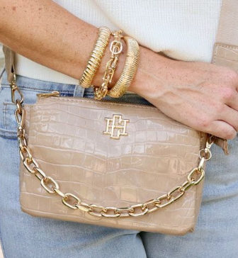 This fashion forward crossbody features a patent croc fabric. It has a removable gold chain that can be used as a carry strap in addition to a nylon strap that is adjustable and removable. It has a top zipper closure as well. The interior of this bag is fantastic at keeping you organized. It features a center zippered section and two open sections. It also has one internal zippered pocket and one large open pocket.