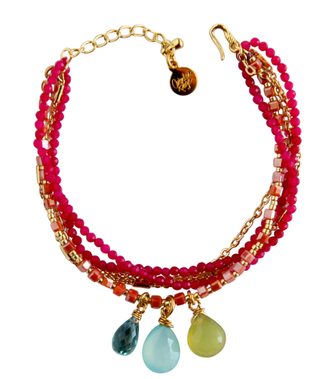 This Marina bracelet has it all going on for the perfect delicate layer. Five strands of chain, micro gemstones, and beads are finished with complimenting teardrop shapes, plated hook and the Catherine Page gold dipped logo stamp. Approximately 7.5" length with end chain for minor adjustments.