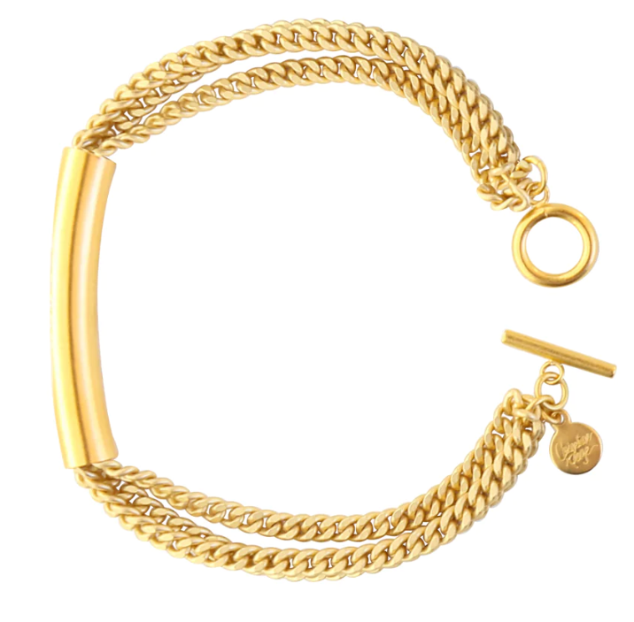 The Morgan bracelet is perfect for everyday metal layering. Our 22k gold dipped metal cut out tube is threaded on chain and finished with our brush plated toggle clasp.