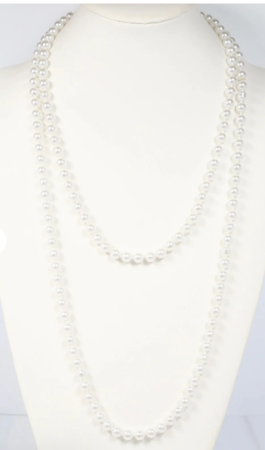 This long pearl necklace is a great statement piece. It can be worn long, doubled or tripled.