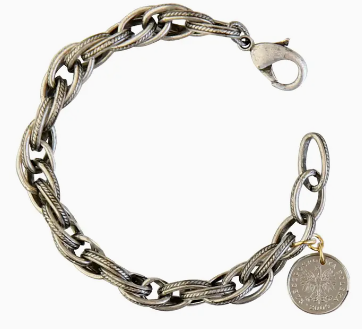 Our Palmer Coin bracelet features a chunky woven chain with a small gold or silver dipped international coin. Approximately 7.5" length with lobster clasp. Handmade in our studio.