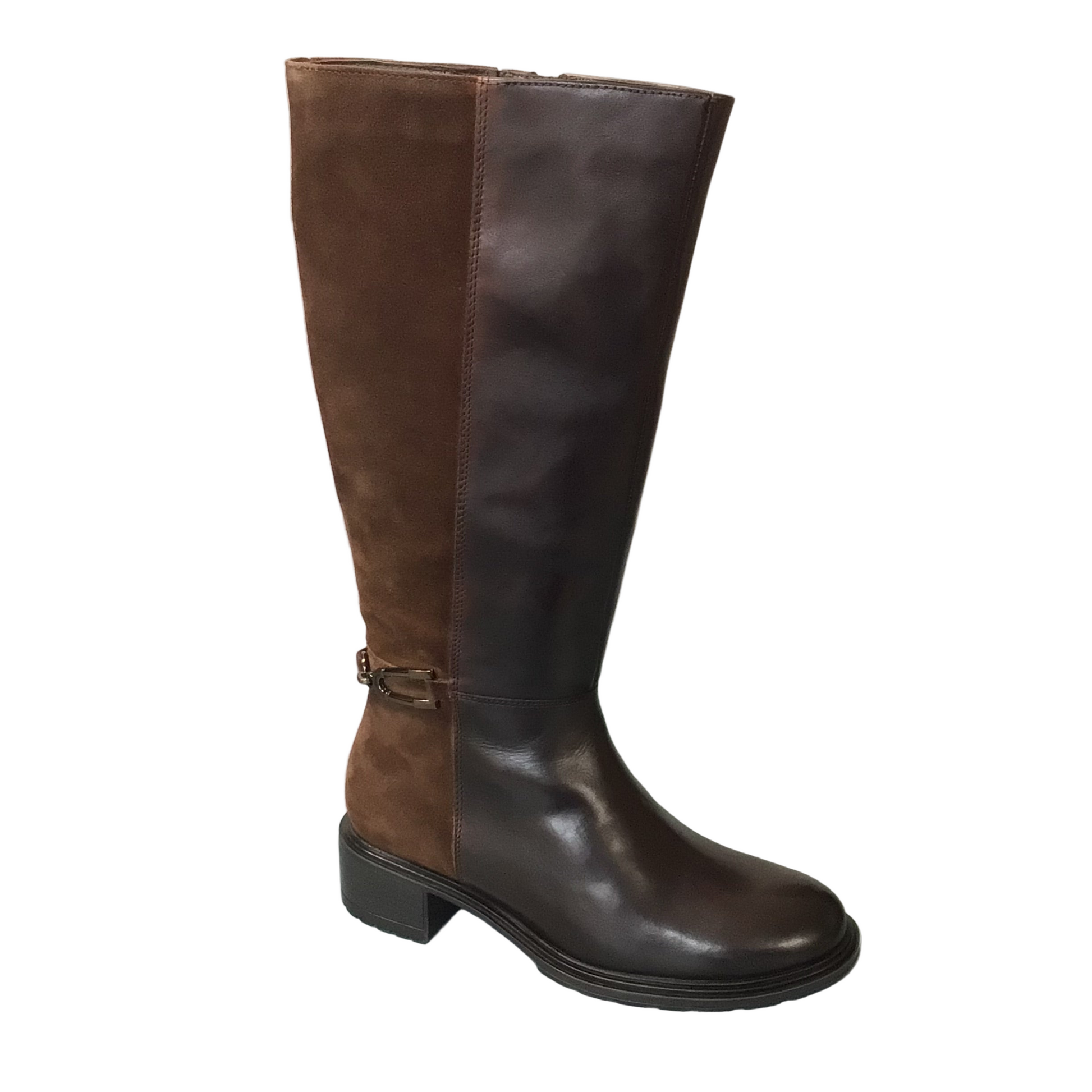 Gleaming hardware stands out at the ankle of a knee-high leather boot furnished with a cushioned insole for lasting comfort.