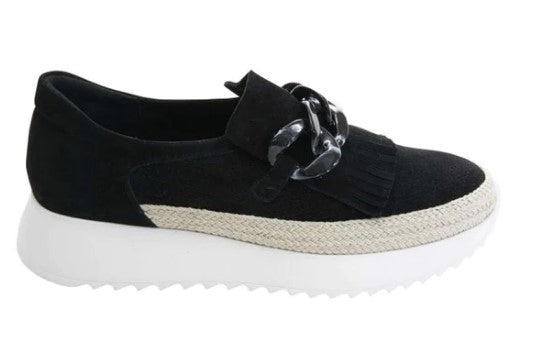 Chain-accent kiltie athleisure shoe. Braided rope trim. Perforated suede upper. Ultra-padded removable insole. 1.5 inch treaded rubber sole.