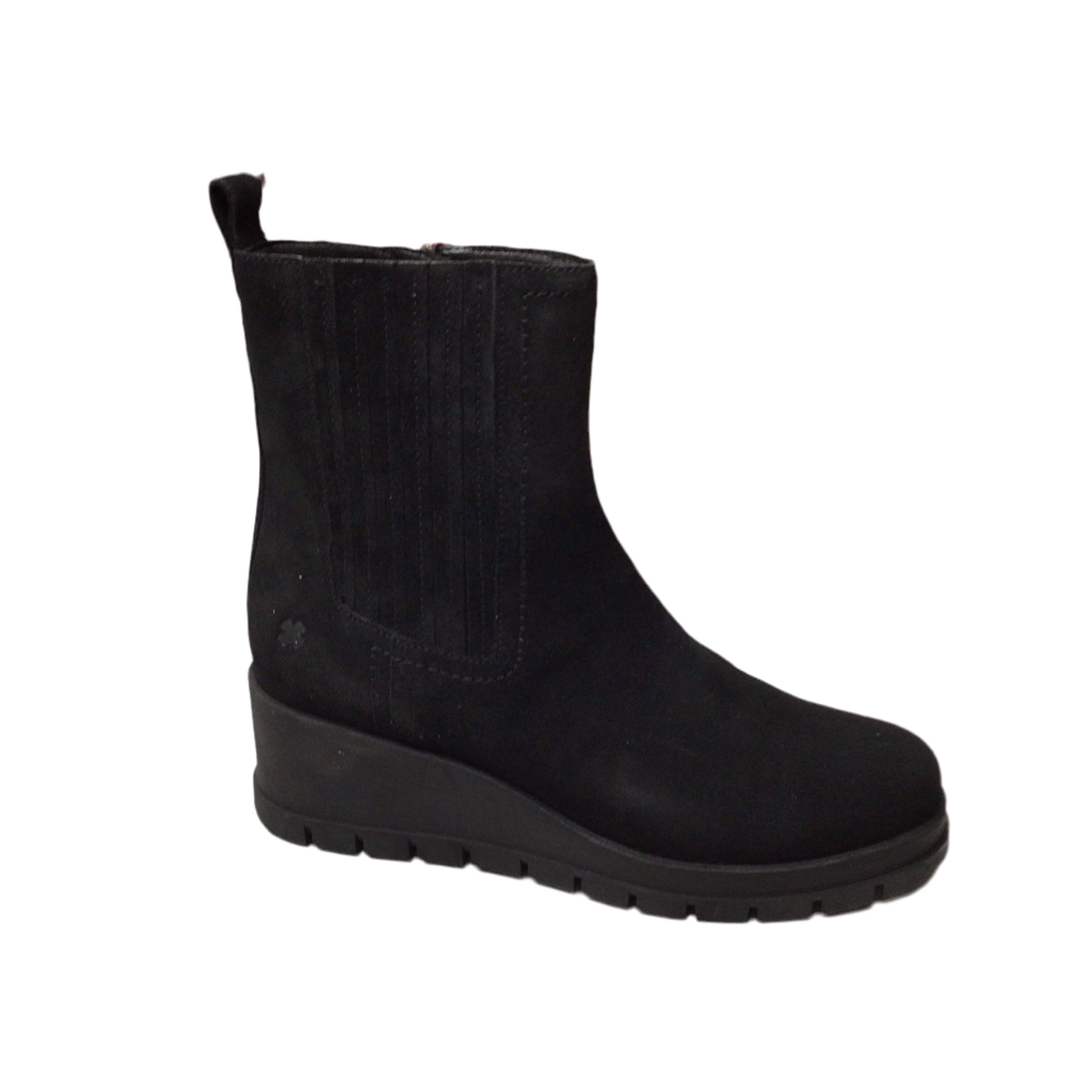 Showcase your unique style with this Chelsea boot, designed with a sturdy wedge heel and a soft suede upper accented by panel-style side details. It features a rounded toe and convenient side zip closure. The boot stands about 6.37" tall with a 10.7" leg opening, including a 1" platform and 2.1" wedge heel for added height and comfort. Finished with a durable rubber sole, it’s the perfect blend of fashion and function.