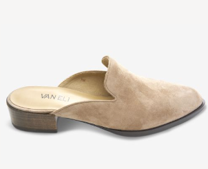Suede loafer-style mule. Padded insole. 11/4" stacked heel. Rubber sole.