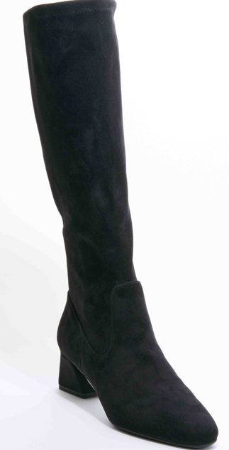 A stretchy socklike shaft creates a sleek, streamlined aesthetic in this knee-high suede boot that always keeps comfort underfoot with its chunky block heel and plush padded insole.
